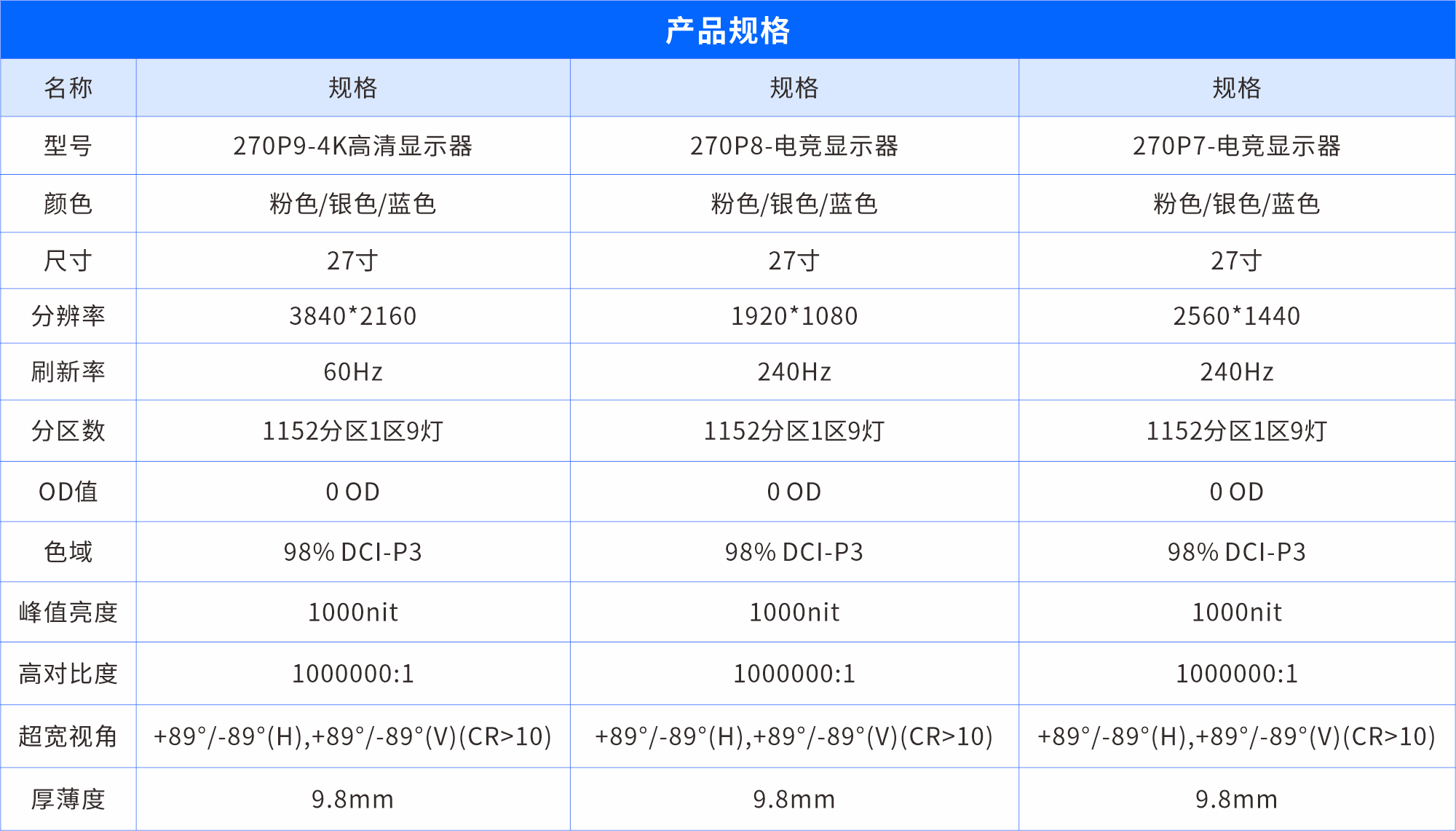 27寸显示器是由液晶屏、膜材、背光模组、铝合金外框等组成的平面显示屏,采用1152分区Mini LED全陈列动态背光,是一款超薄、微边设计、高刷新率的显示屏,可升降旋转万向调节观看视角,搭配丰富的接口,以满足不同人群场景的使用需求。