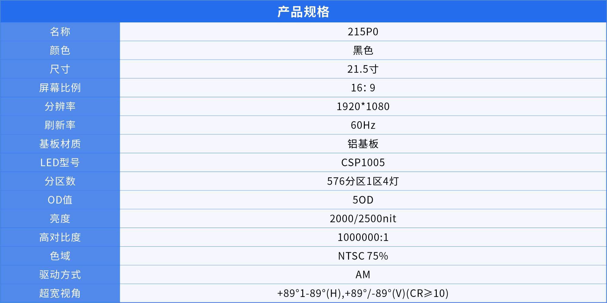 背光模组为液晶显示器面板的关键零组件之一,由于液品本身不发光,背光模组之功能即供应充足亮度与分布均匀的光源,使其液晶面板能正常显示影像。215PO由光源(铝基灯板)、背板、BCON板(含电源转接板)、算法板、OC组成背光显示模组,用于为21.5寸液晶显示器提供背光。