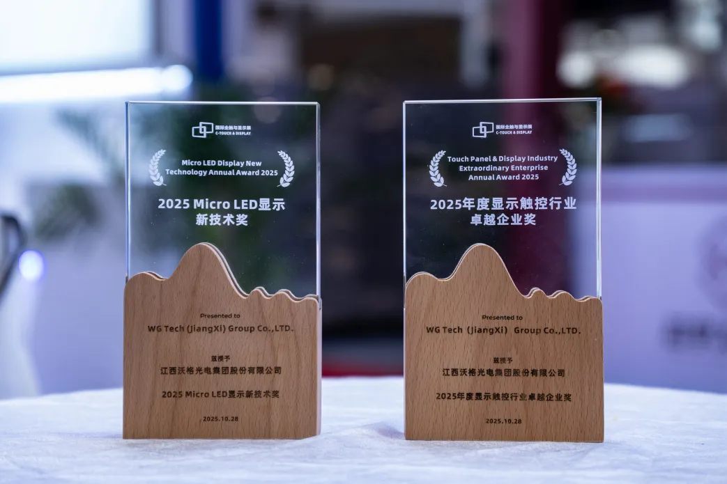 在展会主办方组织的行业评奖环节,沃格光电凭借多年来在玻璃基领域的持续投入研究与创新突破,从众多行业佼佼者中脱颖而出并荣获“2025 Micro LED显示新技术奖”和“2025年度显示触控行业卓越企业奖”。